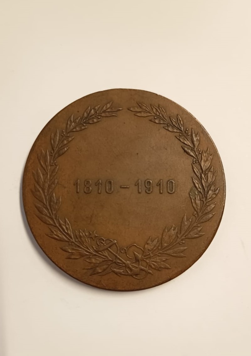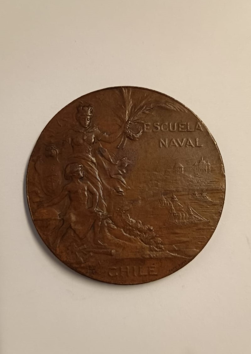 Medalla circular, en su anverso presenta a una figura femenina coronada, junto al extremo izquierdo, sostiene el escudo de la Armada y en su otra mano tiene una corona de laureles y palmas, junto a ella, se observa un joven con un globo terráqueo y a sus pies un cuadrante y un telescopio; en plano de fondo hay una bahía con embarcaciones y el edificio de la Escuela Naval. El reverso tiene una corona de laureles y al centro la fechas 1810-1910, junto al extremo inferior, aparece la figura de un ancla y una estrella.