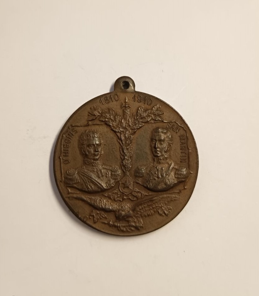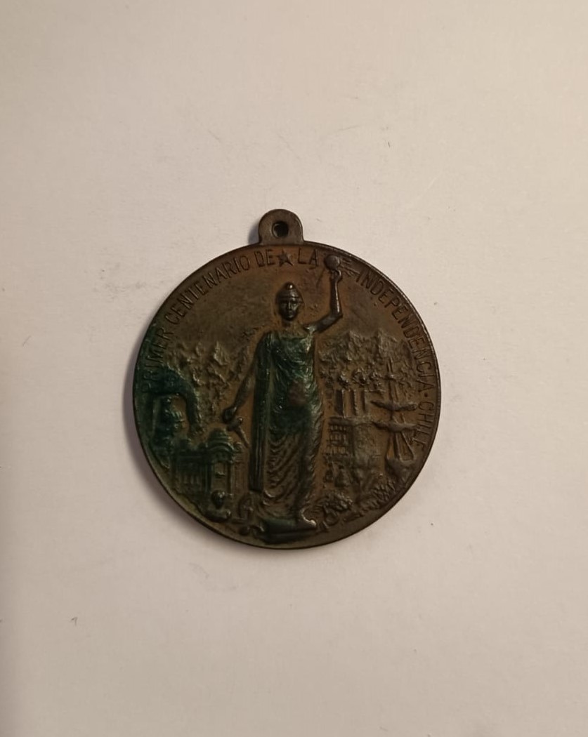 Medalla circular, al extremo superior tiene un breve aro perforado. El anverso presenta el retrato de dos militares y al centro un elemento vertical con hojas de laurel en su base tiene el escudo chileno y bajo este, se observa la figura de un cóndor que porta un estandarte; tiene inscrito la identificación junto a cada personaje: O"HIGGINS y al otro extremo SAN MARTIN. El reverso presenta una figura femenina, con vestimenta clásica y gorro frigio, en plano posterior embarcaciones e industrias; presenta inscripción que se lee PRIMER CENTENARIO DE LA *INDEPENDENCIA. CHILE.