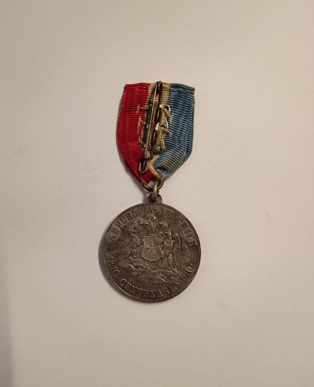 Objeto metálico, circular; es una condecoración del estado de Chile. Al anverso presenta el escudo chileno, sobre nubes y laureles; junto al borde tiene inscripción : REPUBLICA DE CHILE 1810 CENTENARIO 1910. El reverso, presenta la figura de un sol sobre una cadena montañosa, al centro tiene una palmera y bajo esta un elemento arquitectónico con la inscripción INDEPENDENCIA; junto al borde tiene la inscripción * EL ESTADO DE CHILE CONSTITUCIÓN INDEPENDIENTE AÑO D. 1818*. Esta iconografía corresponde al mismo diseño que utiliza medalla que conmemora la Independencia de Chile, acuñada en 1818.