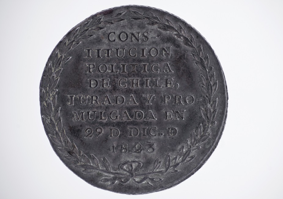Pieza circular, conmemorativa; el anverso presenta una corona de laureles junto la borde y al centro la inscripción CONS/ TITUCION/ POLITICA/ DE CHILE/ JURADA Y PRO/ MULGADA EN / 29 D. DIC, D./ 1823. El reverso tiene una corona de laureles que le circunda y la figura de un sol radiante sobre una cadena montañosa con dos volcanes en erupción, son fumarolas sobre el cráter. (Medina, J.T, Las Medallas chilenas, 1901, pp 170)