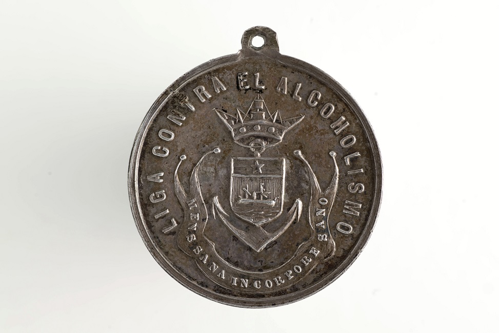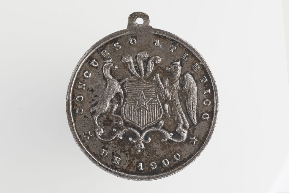 Objeto metálico de forma circular. Por el anverso representa un escudo chileno completo, sostenido por un cuadrúpedo rampante a la derecha y un ave a la izquierda, rodeada por una leyenda. Por el reverso, un escudo coronado en cuyo interior aparece un barco sobre el mar, y un ancla de fondo. Le rodea una leyenda.