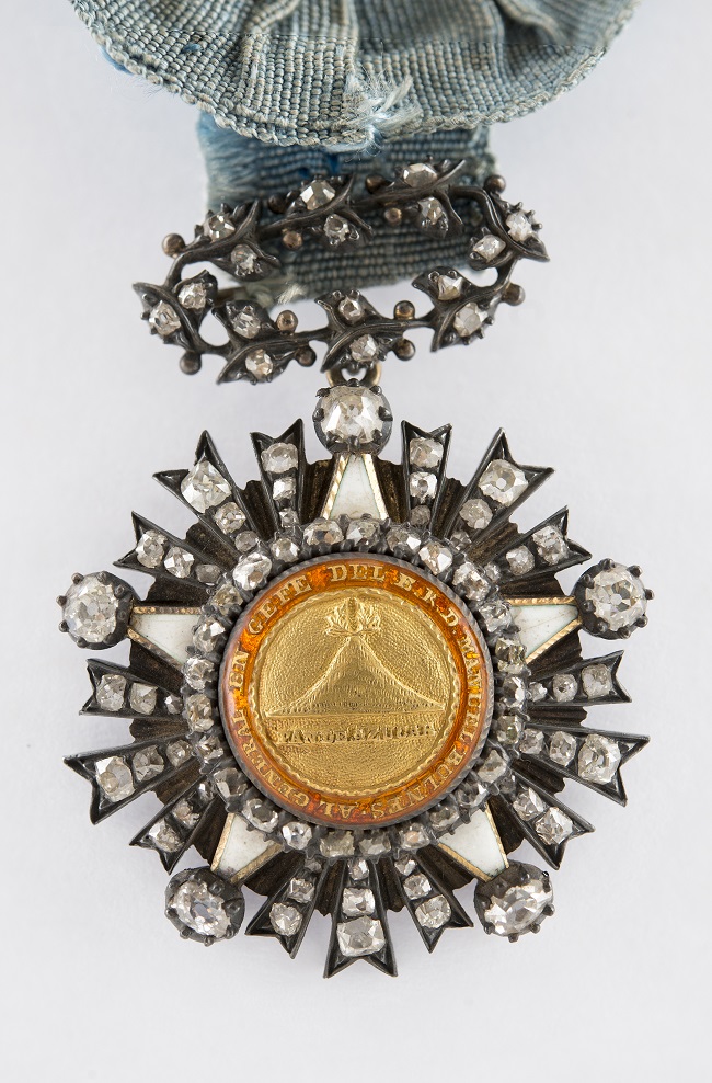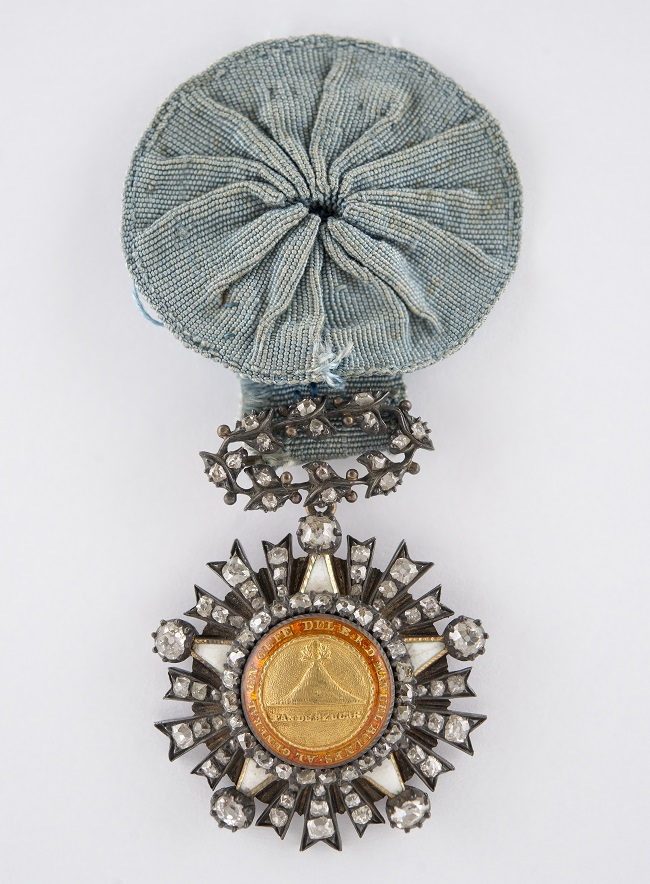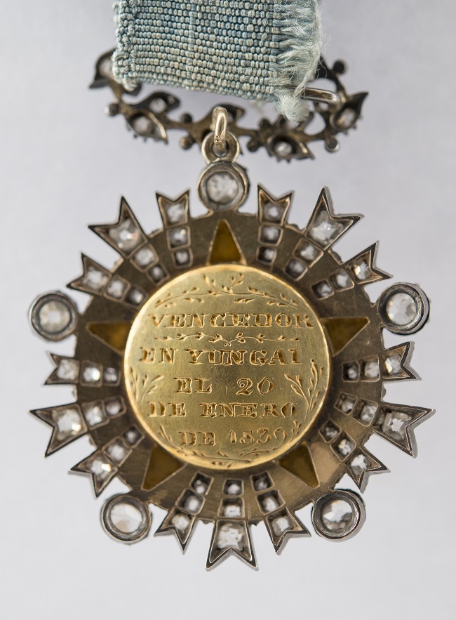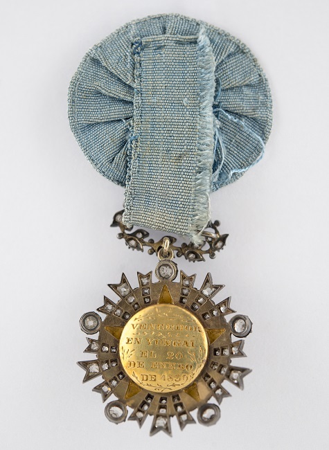 Objeto metálico en forma de estrella con cinco puntas, esmaltadas de color blanco y esta rodeada breves segmentos con piedras preciosas engarzadas; en la parte superior tiene una pasador con piedras y escarapela. El anverso tiene un centro circular con la representación de un cerro, coronado de laureles sobre cima; tiene inscripción en la base y le circunda un aro rojo con inscripción. El reverso tiene un formato circular y al centro un inscripción; el borde presenta un relieve mixtilíneo.