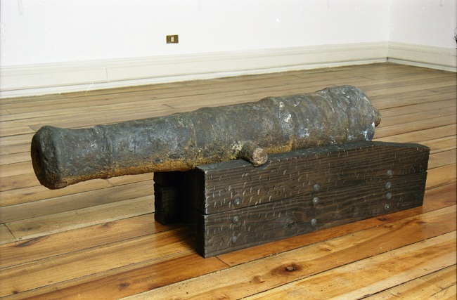 Objeto de metal, de forma tubular y hueco. En su extremo posterior está taponado. En la parte media tiene dos muñones laterales. Se encuentra sobre una base o soporte de madera. Corresponde a una pieza de artillería que lanza proyectiles a larga o mediana distancia.