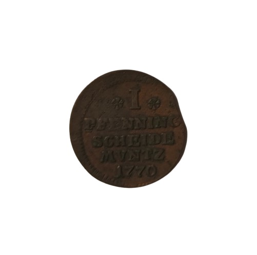 Moneda metálica de color cobrizo y forma circular. Por el anverso representa un hombre de cuerpo completo portando un garrote con la mano derecha y en el exergo la ceca I.A.P. Por el reverso, la denominación *I* PFENNING SCHEIDE MVNTZ 1770.