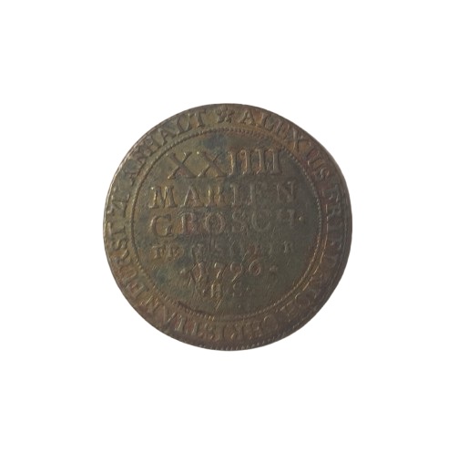 Moneda metálica de forma circular y color bronce, con zonas más oscurecidas. Por el anverso representa un oso coronado caminando sobre el muro de un castillo hacia la izquierda. Por el reverso, al centro la denominación XXIIII MARIEN GROSCH FEIN SILBER 1796 y en el exergo la ceca ·H·S· correspondiente al maestro acuñador Hans Schlüter, rodeado por la leyenda ALEXIUS FRIEDRICH CHRISTIAN FURST ZU ANHALT.