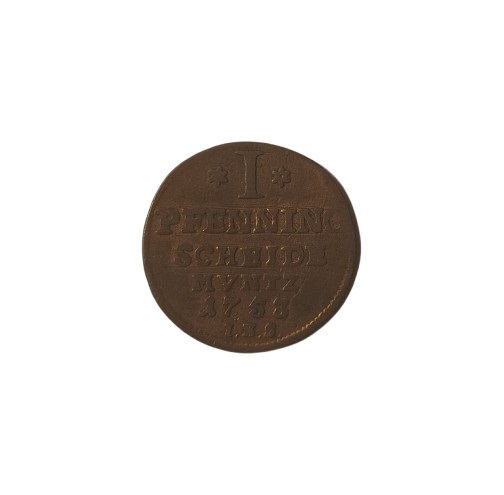Moneda metálica de forma circular y color cobre oscuro. El anverso se ve muy borroso, representa un animal cuadrúpedo hacia la izquierda, caminando sobre un muro. Por el reverso aparece la denominación *1* PFENNING SCHEIDE MVNTZ 1753 y en el exergo la ceca I.H.S. del acuñador Johann Heinrich Siegel.