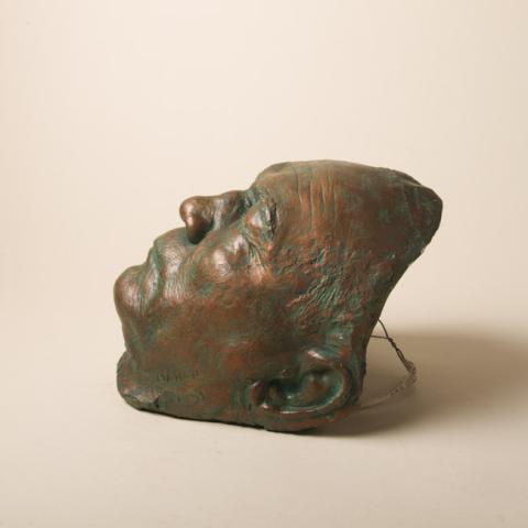 Máscara de yeso, pintada de color bronce y pátina verdosa. Retrato de figura masculina que presenta los ojos cerrados. Destacan arrugas horizontales en la frente, nariz ancha y labios finos.