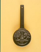 Objeto utilitario. Tiene una forma redondeada que se une a una forma rectangular y alargada. En la superficie de la parte redonda contiene algunos elementos decorativos en relieve
