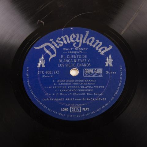 Objeto de uso doméstico compuesto por un disco de vinilo de color negro con surcos en circunferencia. Al centro tiene una etiqueta de papel de color azul impresa con tipografía gris. Además tiene un orificio pequeño. Al lado derecho de la etiqueta tiene un papel manuscrito con un número. Se encuentra en una carpeta de cartulina de color café, la cual tiene un papel manuscrito.