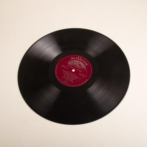 Objeto de difusión musical compuesto por un disco de vinilo y su carátula. El disco de vinilo es de color negro con surcos en circunferencia. En su parte central tiene una etiqueta circular de color burdeo con tipografía de color dorado, y un orificio circular al centro.