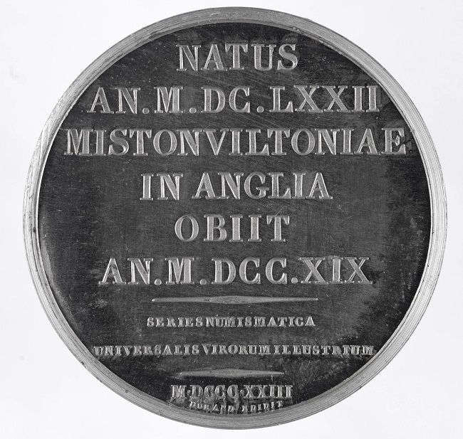 Objeto metálico de forma circular. Por el anverso representa una leyenda en el campo. Por el reverso representa un busto de perfil hacia la derecha y leyenda en arco a los costados.