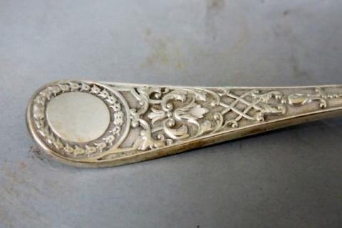 Conjunto de seis piezas con función utilitaria y forma alargada, realizadas en metal. Todas ellas tienen superficies lisas en la parte superior, y en la inferior tienen motivos decorativos vegetales y geométricos