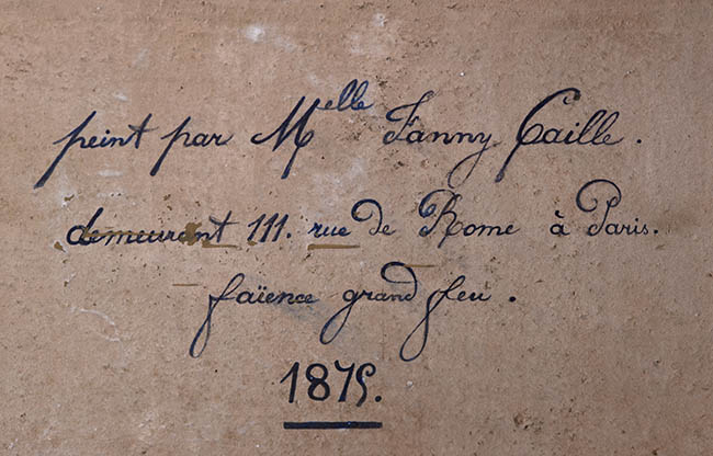 Peint par Melle. Fanny Caille./ demeurant 111. Ru de Rome á Paris/ faience grand bleu./1879