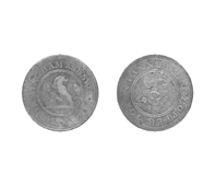 Objeto metálico de forma circular con borde regular, con dos caras semi borrosas y en relieve. Por ambos lados se distingue una figura central al interior de una circunferencia, rodeado por leyenda.