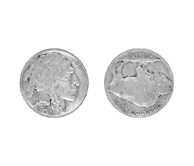 Objeto metálico de forma circular con dos caras. Una de las caras representa la silueta de un busto masculino de perfil hacia la derecha. Al reverso se distingue un la silueta de un búfalo con leyenda en arco superior y en la parte inferior.