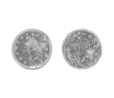 Objeto metálico de forma circular con dos lados, ambos semi borrosos. Por uno de los lados se distingue un busto de perfil hacia la izquierda, con gorro frigio y rodeado de circunferencia de estrellas. Por el otro lado la imagen se ve borrosa.