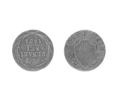 Objeto de formato circular, metálico; en ambas caras presenta relieves. El anverso exhibe un escudo en el campo central, con un diseño partido y la base apuntada, flanqueada por elementos vegetales y junto al borde la inscripción CANTONE/TICINO. El reverso presenta una inscripción en el campo medio: DENAR/SEI/1835, circundada por un corona con hojas de palmas.