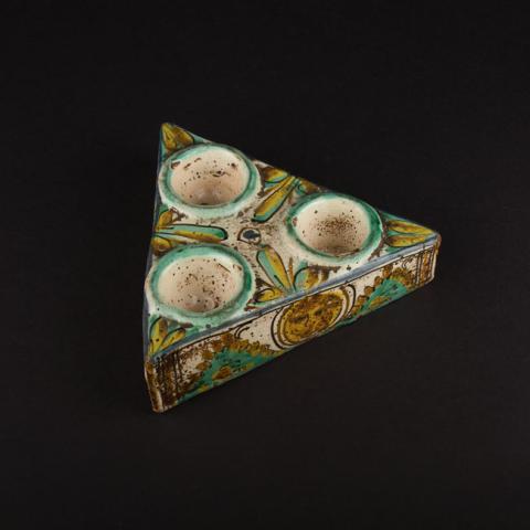 Objeto de uso personal elaborado en cerámica esmaltada y policromada. Cuerpo triangular. En la parte superior tres recipientes circulares. Base plana ahuecada. Superficie blanca con diseños de colores verde, azul y amarillo.