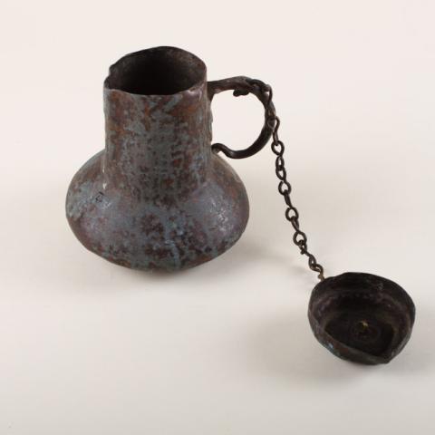 Contenedor metálico de cuerpo lentiforme y base plana. Cuello cilíndrico. Boca con terminación apuntada a modo de vertedero. Asa en el cuello fija mediante remache. Terminación opuesta en espiral. Tapa fija mediante cadena al asa.