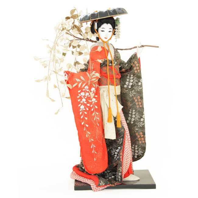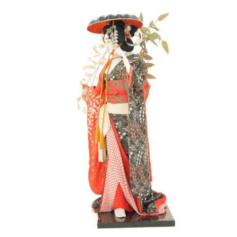 La figura se presenta erguida, levemente contorsionada hacia su derecha y con los brazos abiertos al costado. De tez blanca, labios color rojo y ojos con la comisura de los párpados prolongada. Viste un vestido largo de colores blanco, rojo y negro, en tela estampada con motivos vegetales, mangas amplias y ajustado en la cintura por una banda de tela, tipo quimono. En la mano izquierda sostiene una rama con hojas.