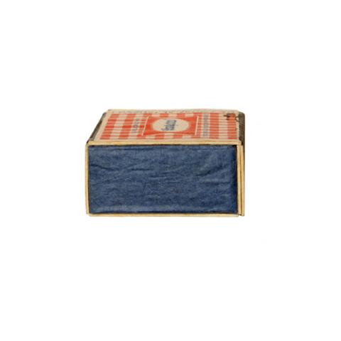 Compuesto por un cuerpo con forma de paralelepípedo rectangular, dividido en dos secciones: un receptáculo de menor tamaño que se desliza en una tapa, abierta en sus extremos, para el cierre y/o abertura. Fabricado en láminas de madera forradas en papel. La cara frontal y posterior de la tapa corresponde a un raspador de color marrón oscuro. La cara inferior y laterales son de color azul. La cara superior, presenta franjas horizontales y verticales de color blanco y rojo; al centro figura geométrica elipsoidal de color blanco sobre rojo; y letras. Contiene fósforos.
