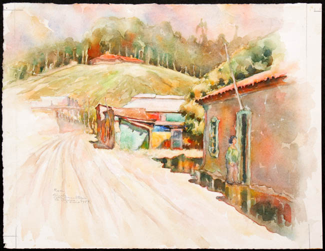 Composición en base a un paisaje urbano. Presenta una vista lateral en perspectiva de una calle con casas y una figura humana al lado derecho. Planos posteriores con cerros, casa y vegetación. Manchas con predominio de los colores verdes, marrón, rojo y naranja.