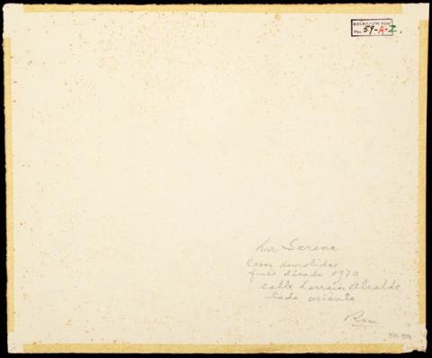 Composición en base a un paisaje urbano. Presenta una vista lateral de una calle. Al lado derecho casas con techos a dos aguas, puertas y ventanas. Al lado izquierdo, planos posteriores de arbustos. Manchas con predominio de los colores violetas, rojo, naranja y verde sobre fondo blanco.