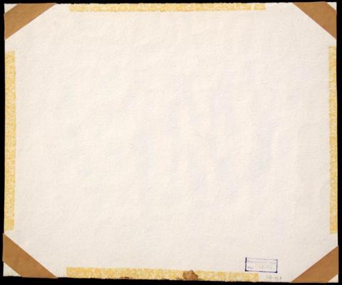 Composición en base a una vista lateral de un muro. En primer plano, presenta una calle con sombra reflejada al costado derecho. Tiene una escalinata con dos peldaños y puerta frontal. En la parte superior, una cubierta con tejas. Manchas con predominio de los colores marrón, naranja y verde. Contornos lineales color negro.