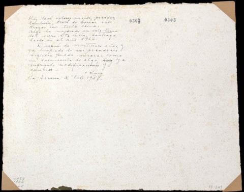 Composición en base a un paisaje. Presenta un camino en perspectiva rodeado de árboles y vegetación, que proyecta su sombra. último plano, muro con almenas. Manchas con predominio de los colores verde, marrón, naranja y violetasobre fondo blanco. Algunos contornos lineales color negro.
