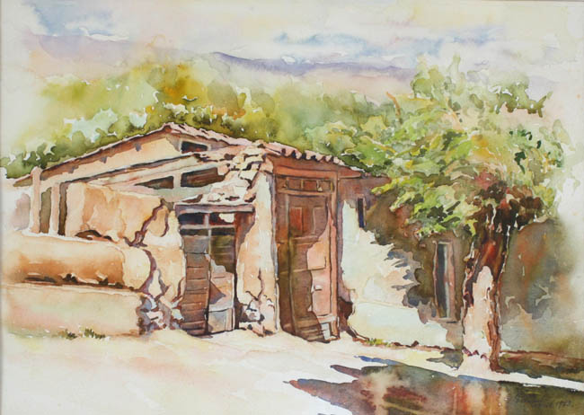 Composición en base a una vista lateral de casa. Presenta una puerta y portón con techo a dos aguas con grietas. Al costado derecho, árbol y sombra proyectada en el suelo. Manchas con predominio de los colores marrón rojizo, verde. CIelo azul y violeta.