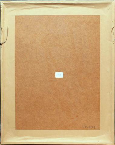 Composición en base a una fachada de arquitectura monumental. Presenta dos columnas que flaquean una entrada en sobre nivel; vano con arco y a los costados pilastras; en la parte superior de la cubierta decoración con formas vegetales. A los costados, muros con tejas y árboles. Plano posterior, edificios y cielo. Manchas con predominio de los colores marrón rojizo, naranja y verde. Cielo azul sobre fondo blanco. Algunos contornos lineales color negro. Marco marrón oscuro esquinas color cobrizo y paspartú color blanco.
