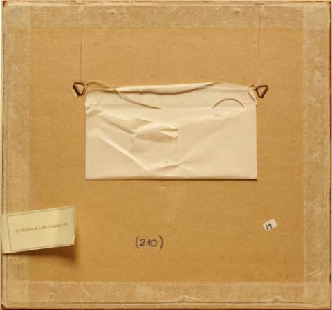 Composición en base a una vista superior de casas. Presenta techo a dos aguas, un segundo piso con terraza rodeado de barandas y techo a dos aguas con faltantes. Último plano, cielo. Manchas con predominio de los colores marrón, rosado y violeta azulado. Cielo azul y violeta sobre fondo blanco. Marco dorado y paspartú color blanco.