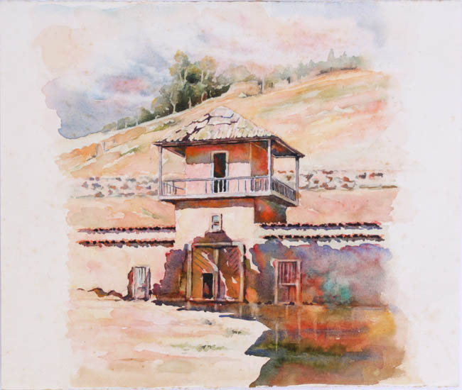 Composición en base a una vista frontal casas. Al centro, casa de dos pisos con balcón rodeado de una baranda y techo a dos aguas. En plano posterior, una pendiente con vegetación en la cima. Manchas con predominio de los colores marrón, naranja, verde y rojo sobre fondo blanco
