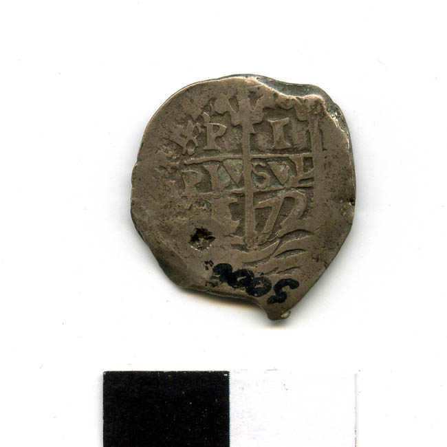 Forma circular irregular. Fabricado en metal color plateado. En una de sus caras, una franja, division tripartita con letras, numeros arabigos (72), romanos en sobre relieve. En la cara opuesta cruz con cuartelado de castillos y leones en sobre relieve. Presenta una perforacion en uno de sus bordes.