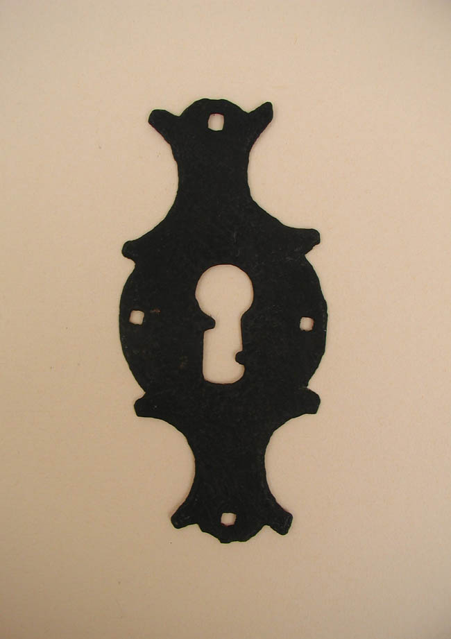 Pieza metálica laminar, lisa y sin decoración, de forma romboide irregular y color negro. En el centro, una perforación alargada de carácter funcional. Además, se observan cuatro orificios en los extremos superior, inferior y los costados.
