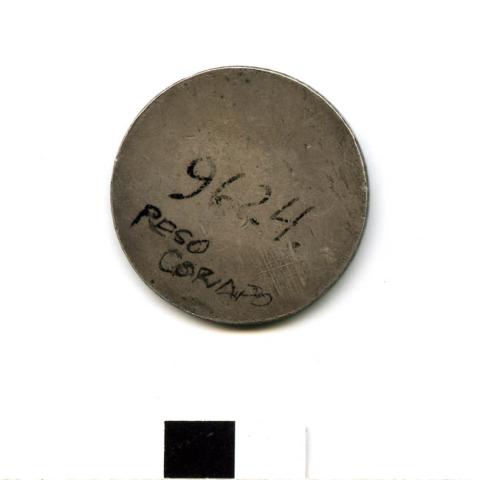 Forma circular. Fabricada en metal de color plateado. En el anverso presenta, un escudo con estrella en sobre relieve inscrito en óvalo en bajo relieve con letras. El lado opuesto, es liso.