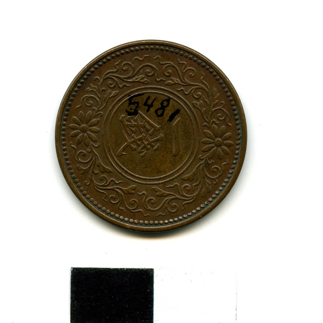 Al reverso, círculo concéntricos con signos caligráficos, circunscrito por formas vegetales y florales en sobre relieve.