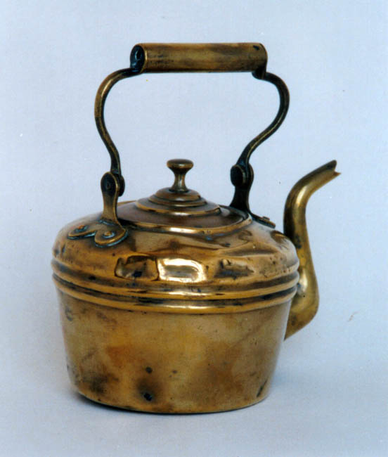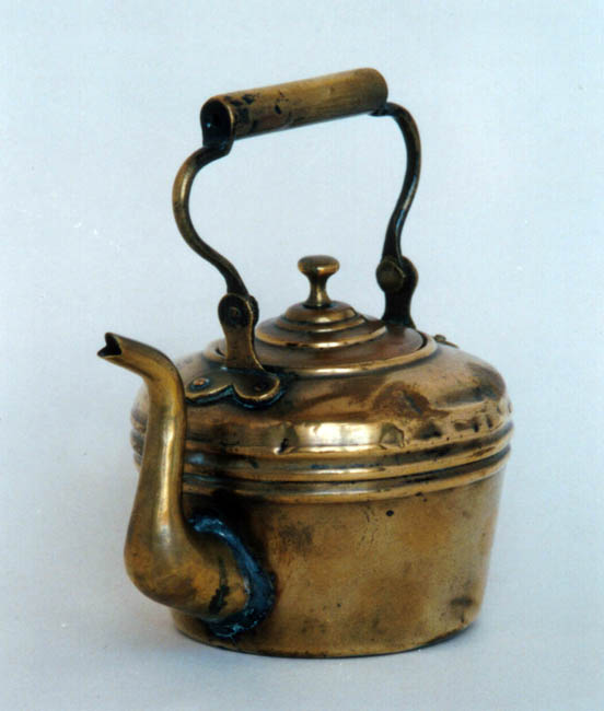 Pieza de cuerpo globular, con asa superior, tapa y pico tubular curvo. Presenta color amarillo brillante. Se observan seis remaches —cuatro de bronce y dos de cobre— y soldadura de estaño en la base del pico. Como elemento decorativo, exhibe tres estrías paralelas que circundan el sector superior del cuerpo.