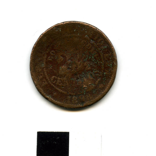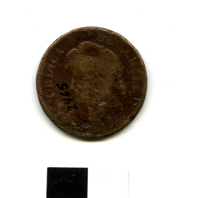 Fabricado en metal color marrón cobrizo. En la cara anversa presenta, una cabeza femenina de perfil en sobre relieve circunscrita por letras. Al reverso, números y letras inscritos en círculo, con letras que lo circumbalan.