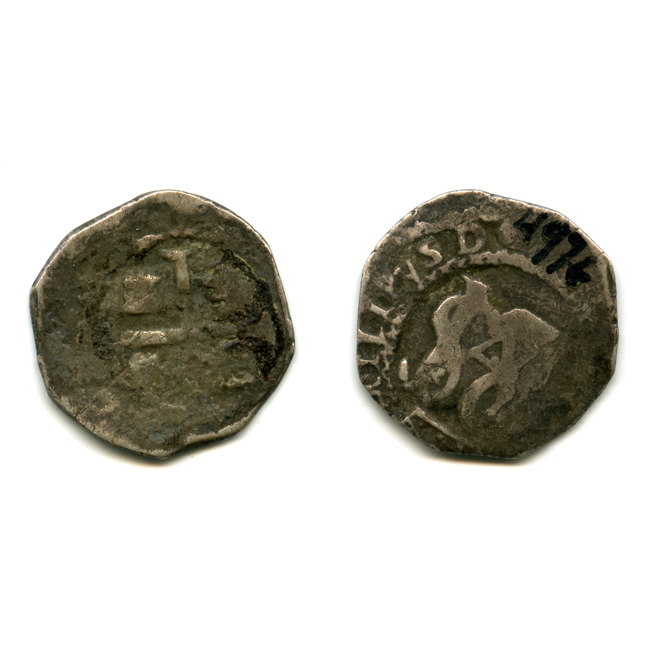 Forma circular irregular. Fabricada en metal de color plateado. El anverso presenta, iniciales en sobre relieve inscrita en círculo y letras. La cara opuesta una cruz cuartelada con castillos y leones.