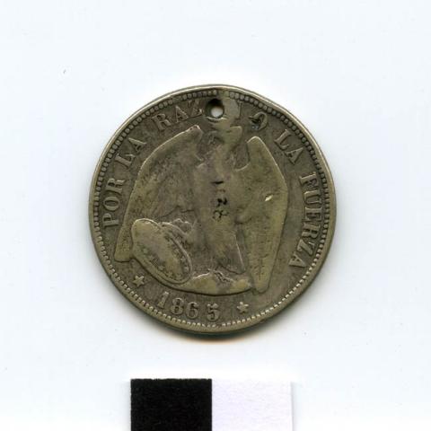 Forma circular. Fabricado en metal color plateado. En la cara anversa presenta, un cóndor en sobre relieve circundado por letras y números. Al reverso escudo con penacho circundado por letras y números. Presenta perforación en uno de sus lados.