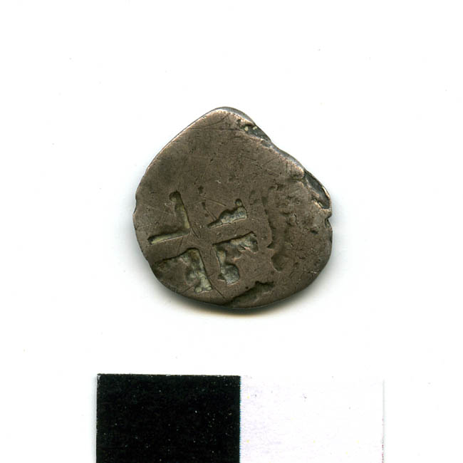 Forma semicircular irregular. Fabricada en metal de color plateado. En una de sus caras presenta, una cruz cuartelada con figuras poco definidas.