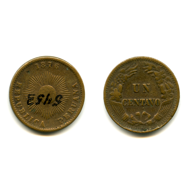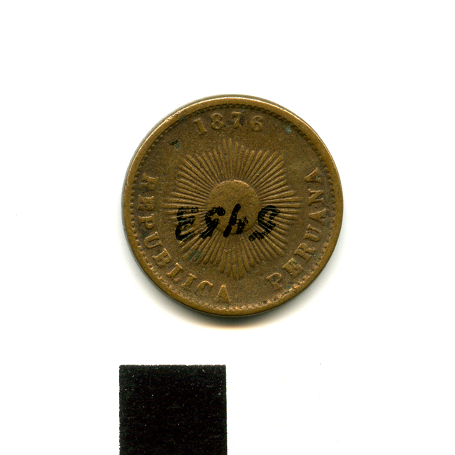 Forma circular. Fabricada en metal color marrón cobrizo. En el anverso presenta, una estrella en sobre relieve, circundada por letras y números. Al reverso, letras inscritas en corona de hojas y flores en sobre relieve.