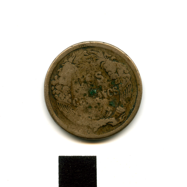 Forma circular. Fabricada en metal color marrón cobrizo. En el anverso presenta, una estrella en sobre relieve, circundada por letras y números. Al reverso, letras inscritas en corona de hojas y flores.