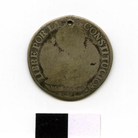 Forma circular. Fabricada en metal color plateado. En ambas caras presenta, letras en todo el contorno y una perforación en uno de sus lados.