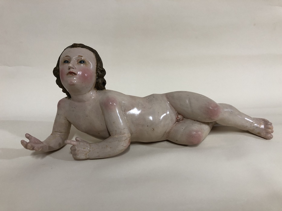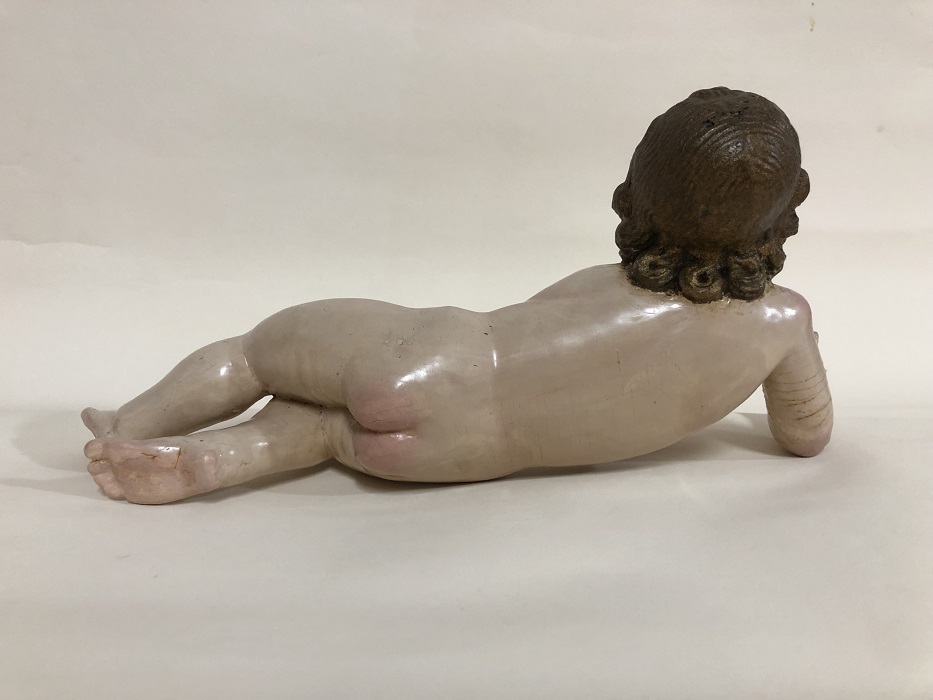 Obra exenta en posición yacente que representa una figura infantil masculina recostada sobre su lado derecho, orientada frontalmente. La figura, desnuda y de cabellera dorada, se sostiene parcialmente sobre el brazo derecho, mientras el izquierdo se encuentra flectado. Ambas piernas aparecen semiflexionadas. La composición se complementa con una prenda de tela brillante de color blanco, tipo túnica.