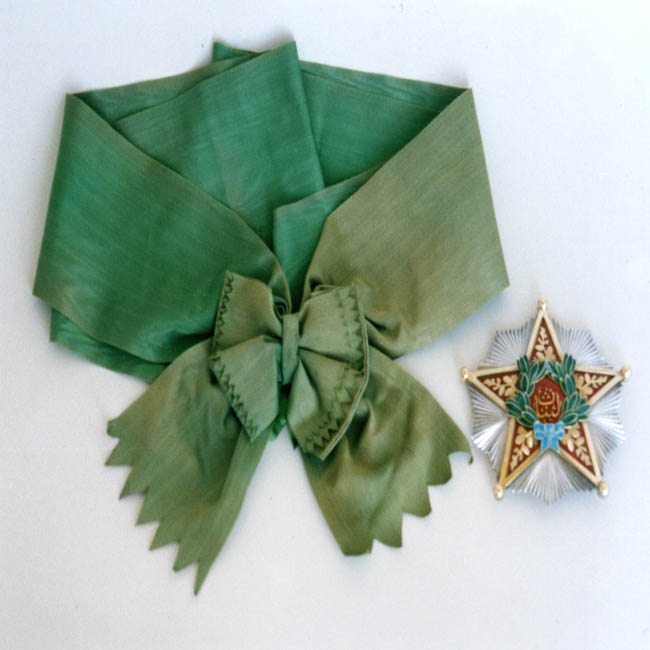 Medalla conformada por una estrella de cinco puntas rematadas en círculos y rodeada de rayos, al centro de la estrella y superpuesta a ella presenta un círculo de ramas rematado en una amarra, y al centro de este señala escritura Árabe. Esta pieza pende del extremo de la banda, a través de argollas.