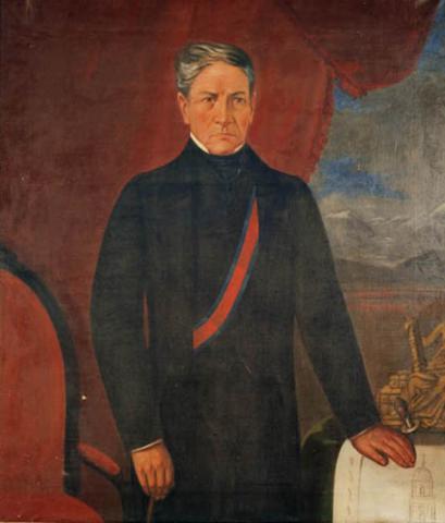 Obra bidimensional de formato rectangular y orientación vertical. Composición en base a figura masculina de pie en tres cuartos de cuerpo y de frente. Viste traje formal de color negro y camisa de cuello subido blanco, cruza su pecho una banda azul y roja. Apoya su mano izquierda sobre un documento extendido sobre una mesa. Al fondo y detrás de cortinajes rojos se observa un paisaje con cerros. La obra se complementa con un marco dorado con decoración vegetal.