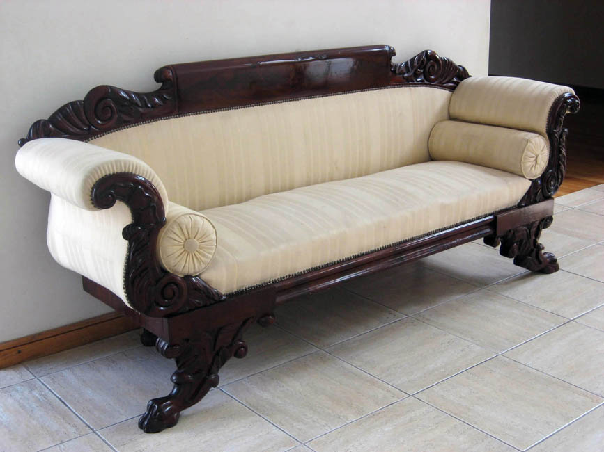 Tapicería: tela listada y semisatinada (no original). Remata los encuentros de la tela y madera, clavos decorativos.