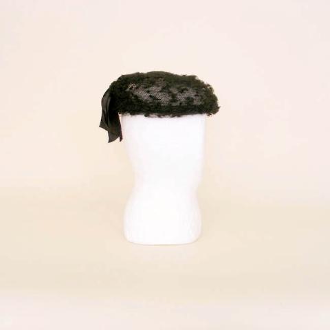 Prenda de vestir femenina para cubrir la cabeza. De gasa color negro con dos cintas frontales cosidas de seda negra y una peineta transparente de sujeción.